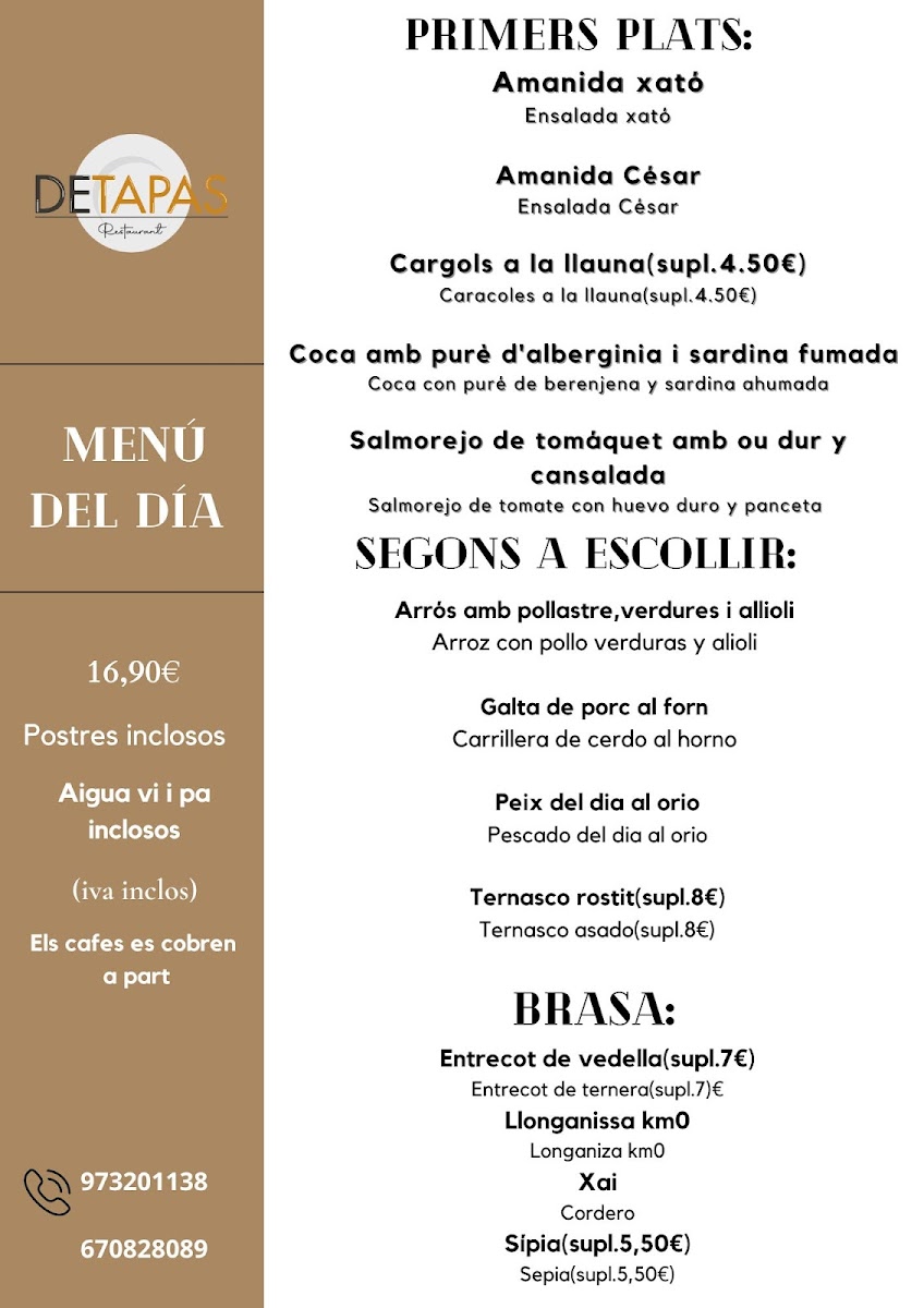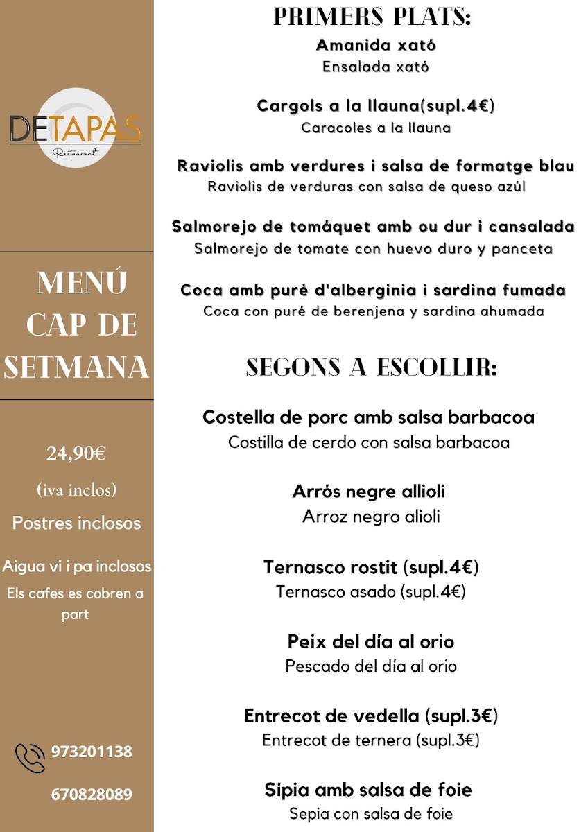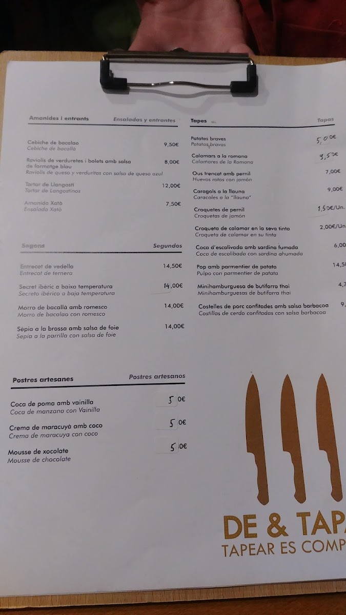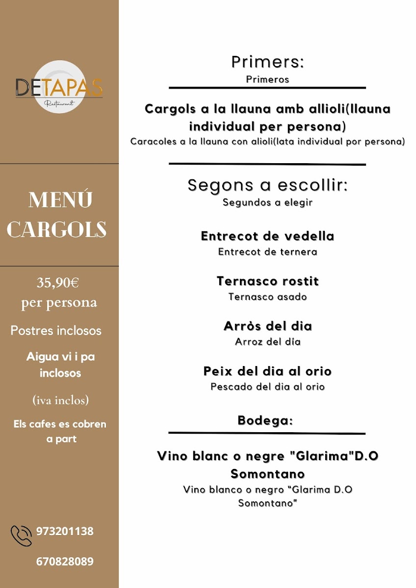 Welcome to D'e & Tapas, a delightful gastronomic gem nestled in Lleida, Spain. This restaurant offers an exquisite menu designed to tantalize your taste buds, showcasing both traditional and contemporary Spanish cuisine. From Monday to Friday, indulge in the delightful Menú del Día for just €17.90, which includes a refreshing salad, a main course, dessert, water, and bread. On weekends, savor a more elaborate Weekend Menu at €25.90 or treat yourself to a unique Caracoles Menu, featuring individual servings of snails and delightful second courses for €35.90.