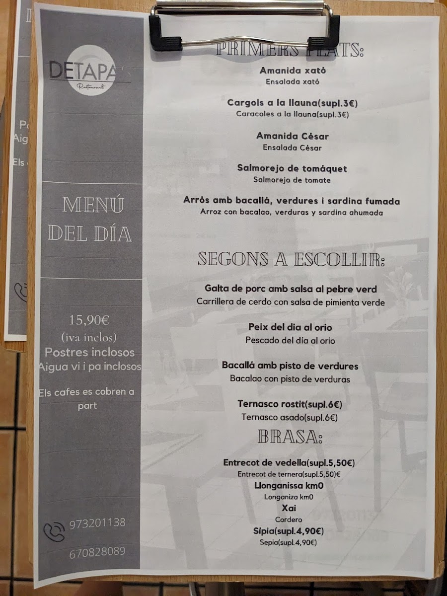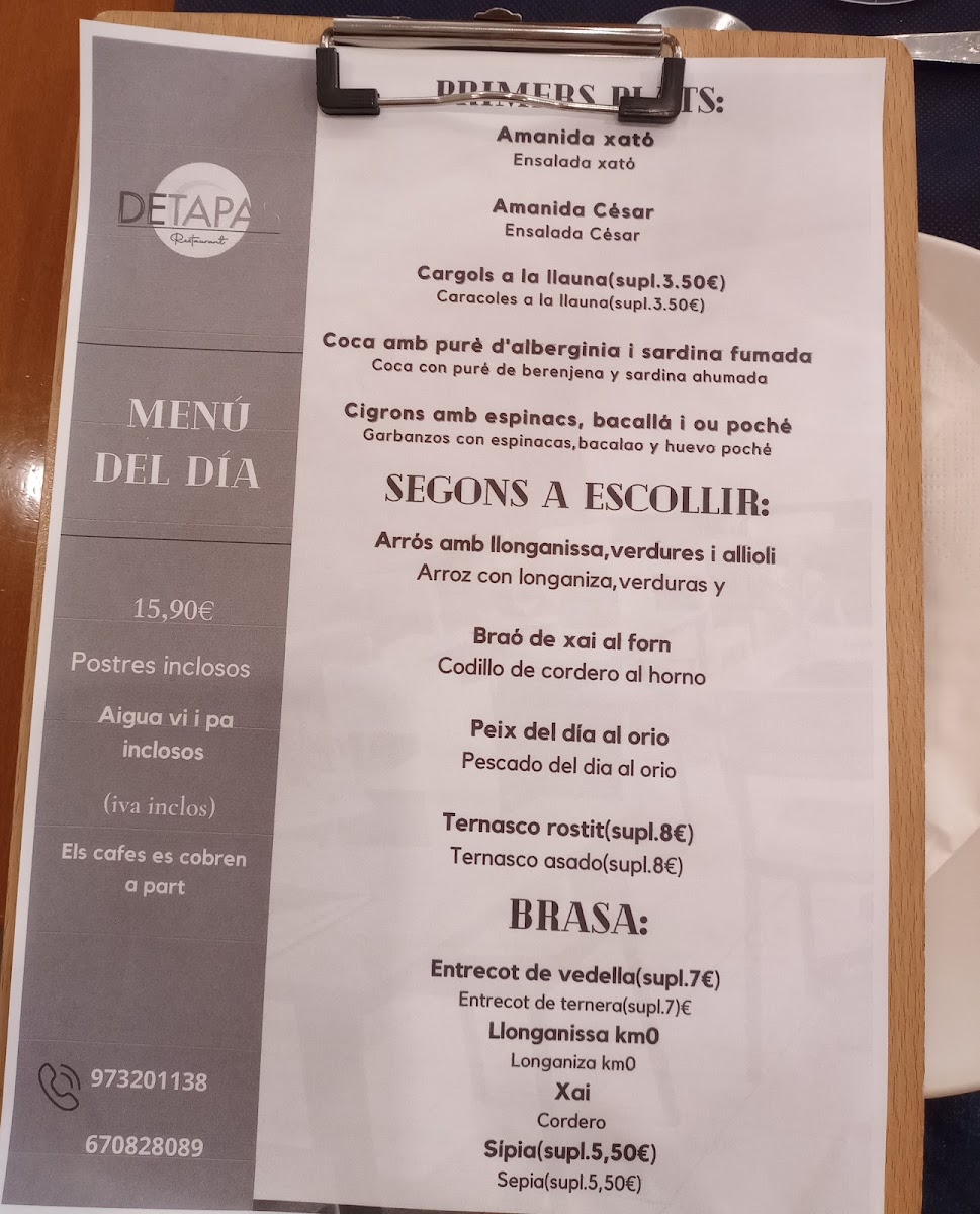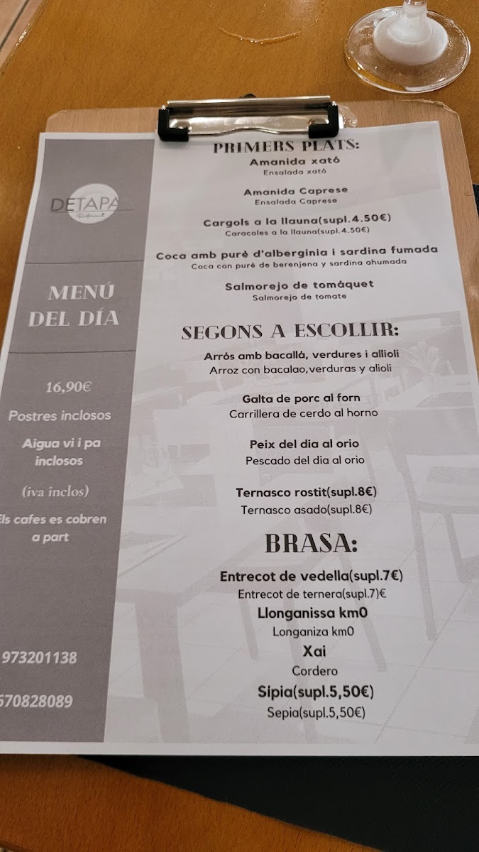 Welcome to D'e & Tapas, a delightful gastronomic gem nestled in Lleida, Spain. This restaurant offers an exquisite menu designed to tantalize your taste buds, showcasing both traditional and contemporary Spanish cuisine. From Monday to Friday, indulge in the delightful Menú del Día for just €17.90, which includes a refreshing salad, a main course, dessert, water, and bread. On weekends, savor a more elaborate Weekend Menu at €25.90 or treat yourself to a unique Caracoles Menu, featuring individual servings of snails and delightful second courses for €35.90.